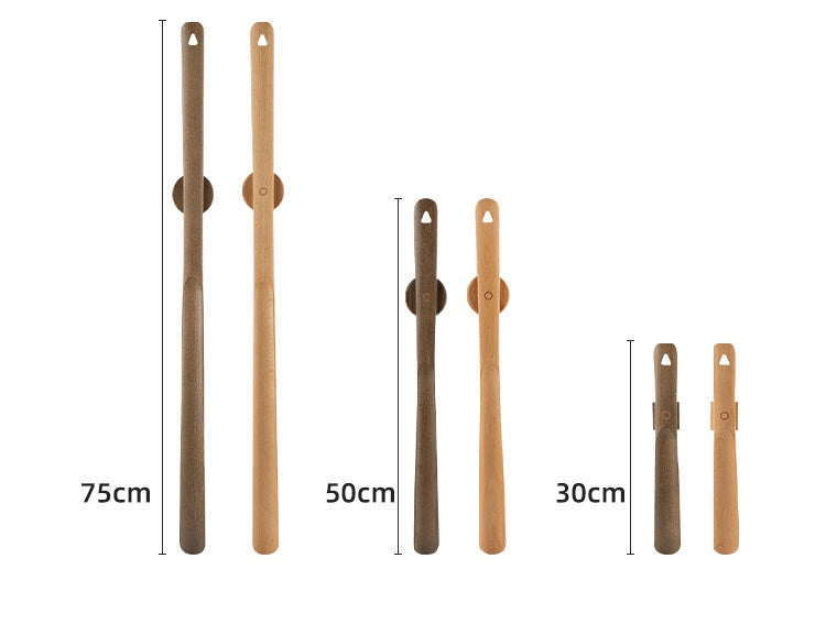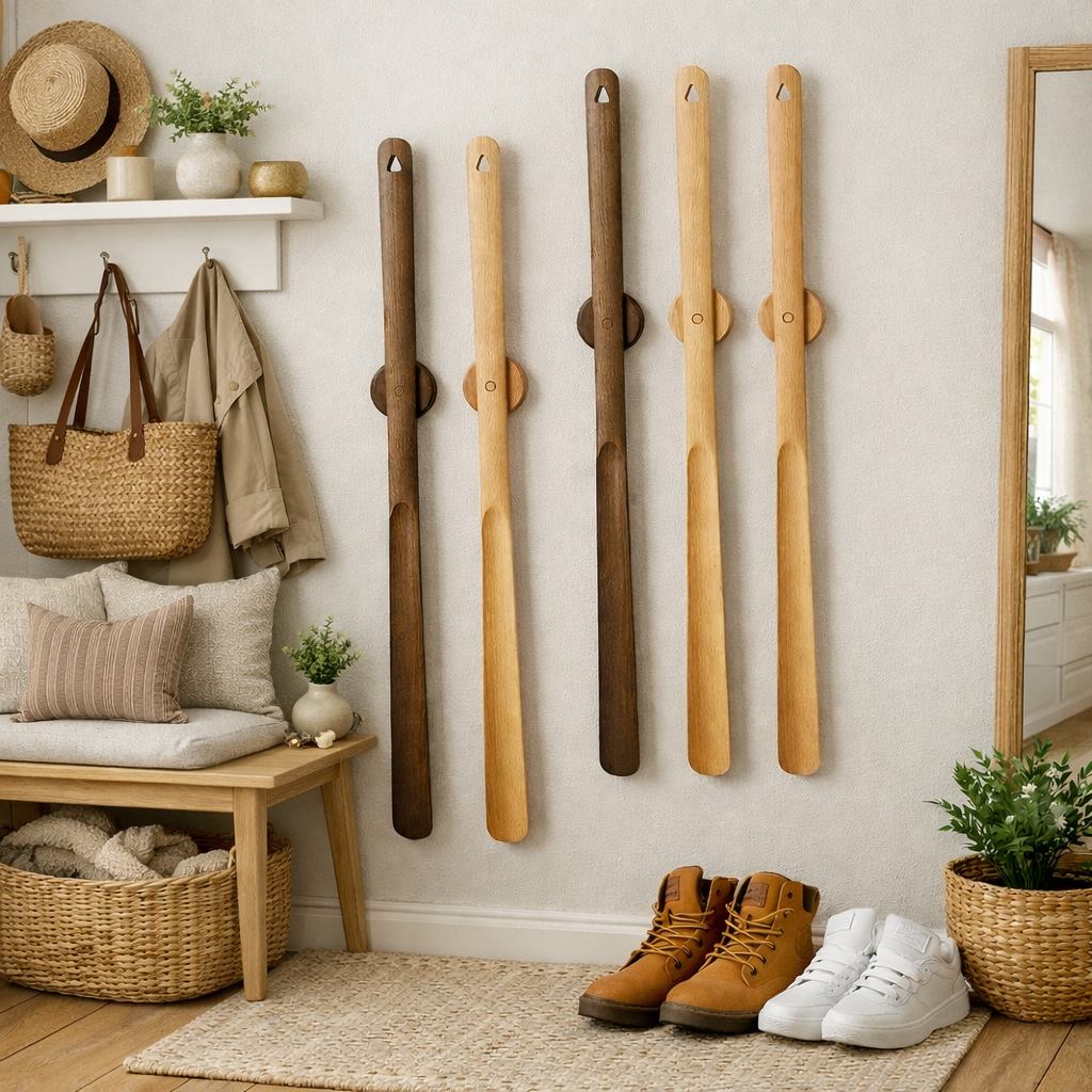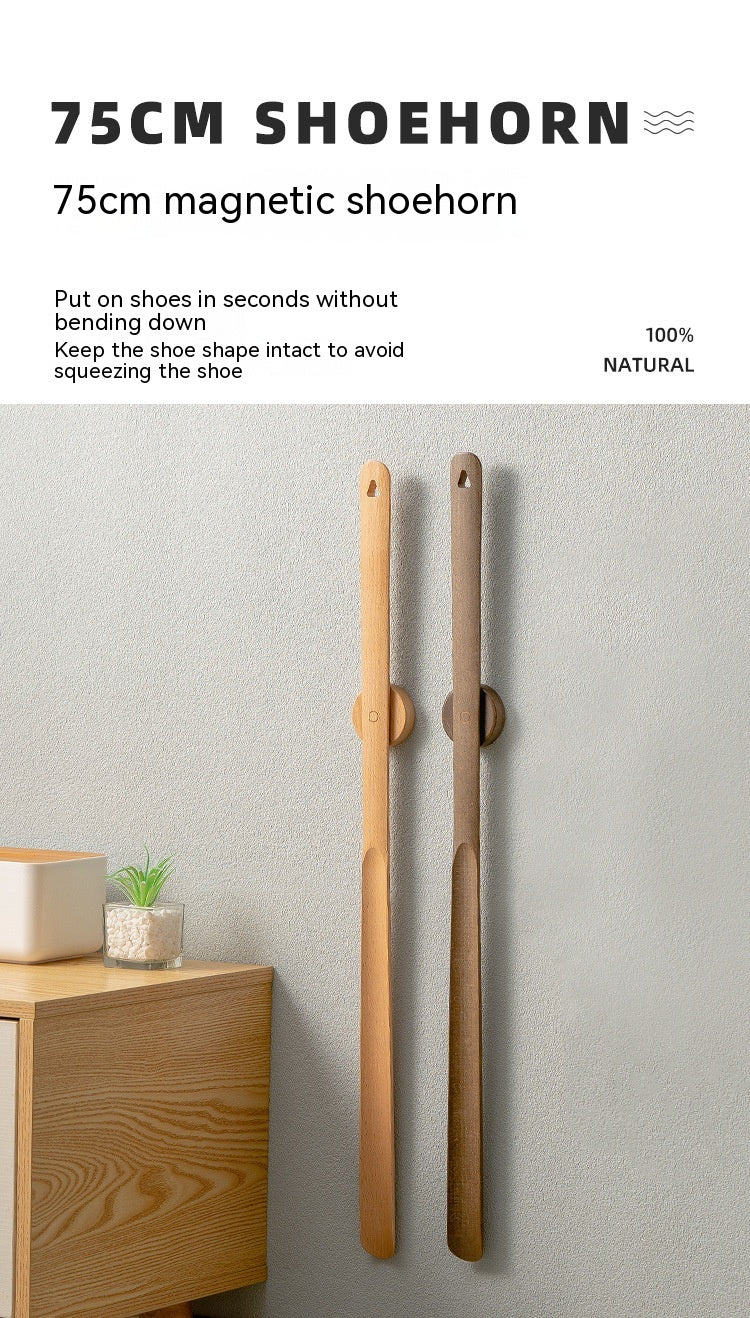 Ett elegant skohorn i massivt bokträ som kombinerar naturlig design med smart funktion. Med sin längd på 50 & 75 cm blir det enkelt att ta på skorna utan att böja sig ned, samtidigt som den magnetiska hållaren gör att skohornet alltid hänger snyggt och lättillgängligt.